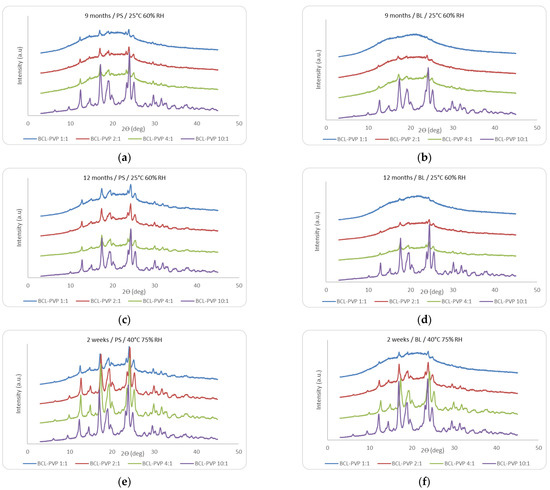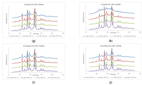 The diffraction studies were performed to analyze the impact of storage conditions on the molecular order of solid dispersions. The analysis of diffractograms presented in Figure 2 indicates amorphization of bicalutamide upon milling since no Braggs peaks characteristic for bicalutamide crystals are visible for the 1:1, 2:1, and 4:1 freshly analyzed solid dispersions. The amorphous halo is seen instead. Given that an amorphous system was obtained even if the content of PVP K29/32 was as low as 20%, a high potential of the polymer was confirmed in stabilization of the molecularly disordered state was confirmed [25]. Only for the 10:1 solid dispersion, the drug remained crystalline as indicated by the well-resolved diffraction pattern (Figure 2). Differences in the diffraction patterns between samples stored at 25 °C and 60% RH in either polystyrene jars or PVC/Al blisters were almost negligible for 9 months (Figure 3a,b). After 12 months, the diffraction patterns of the samples stored in polystyrene containers exhibited more intense peaks than those stored in blisters (Figure 3c,d). Storage in polystyrene jars under the same conditions induced bicalutamide recrystallization as manifested by the presence of low-intensity Braggs peaks superimposed on the amorphous halo in the diffractograms presented in Figure 3c. The 10:1 solid dispersion was crystalline, regardless of the packaging material. For these samples, none of the tested conditions induced any changes in the crystalline structure after 12 months storage (Figure 2 and Figure 3a–j). Given the hygroscopic nature of PVP K29/32, one can expect that samples stored in packaging materials, which do not prevent water permeation, would exhibit a tendency to recrystallization upon moisture absorption and plasticization. Although some traces of recrystallization occurred, the results indicated that the tested packaging materials were able to inhibit water penetration in long-term conditions to the extent that they prevented nucleation and crystal growth. Due to the high glass transition temperatures of the solid dispersions, near 100 °C provided by PVP K29/32, the amorphous samples exhibited satisfactory stability over 12 months storage. The samples packed into PVC/Al blisters were more resistant than those in polystyrene containers.