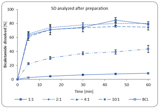 The results showed that freshly prepared amorphous solid dispersions (i.e., 1:1, 2:1, and 4:1 systems) exhibited a 10-fold improvement in drug dissolution in comparison with crystalline bicalutamide, reaching c.a. 80% in all he samples after one hour. Only, dissolution from the 10:1 solid dispersion, which was crystalline, was 5-fold greater than from raw bicalutamide and equal to 43% (Figure 4).