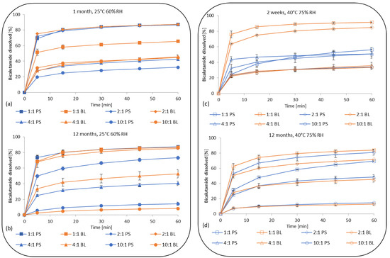 Dissolution of bicalutamide from the 1:1, 2:1, 4:1, 10:1 solid dispersions packed into PVC/Al blisters (BL) and polystyrene bag (PS) after storage in long-term conditions (25 °C/60% RH, left panel) for 1 month (a) and 12 months (b), and accelerated conditions (40 °C/75% RH, right panel) for 2 weeks (c) and 12 months (d); the errors bars represent the standard deviation.