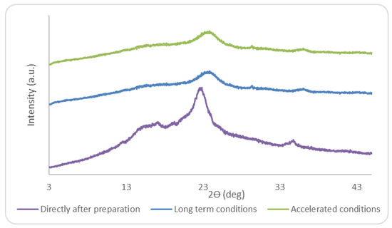 The X-ray diffraction analysis of minitablets performed immediately after preparation showed that the drug existed in the amorphous state since no Braggs peaks were visible in the diffraction pattern (Figure 6). Neither the long-term nor the accelerated conditions influenced the molecular arrangement of bicalutamide (Figure 6). The results obtained for the minitablets differ from those obtained for solid dispersions in powder form, which recrystallized after one month of storage in blisters under accelerated conditions. This may result from the fact that the contact of moisture with the active substance in the amorphous phase was limited due to the compact structure of minitablets, which slow down water penetration into the sample. This also confirmed the high stabilizing efficiency of PVP K29/32. Water uptake and inhibition of crystallization tendency may also be limited by addition of the excipients.