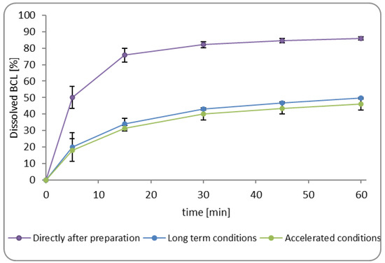 The dissolution profile of bicalutamide from minitablets analyzed immediately after preparation and after six months of storage in long-term (25 °C/60% RH) and accelerated (40 °C/75% RH) conditions. Minitablets were packed into PVC/Al blisters; the errors bars represent the standard deviation.