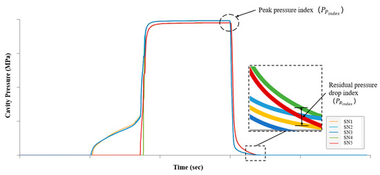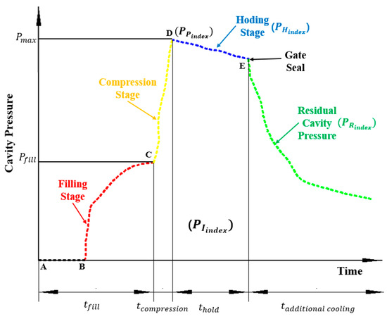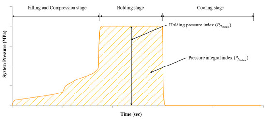 - In addition, by observing typical, in-mold pressure curves, the pressure changes of the melt during different molding stages (filling, compression, holding pressure and cooling) in the cavity were understood, and four quality indices reflecting the molding quality of the product were selected, namely, the peak pressure index (), holding pressure index (), residual pressure drop index () and the pressure integral index ().