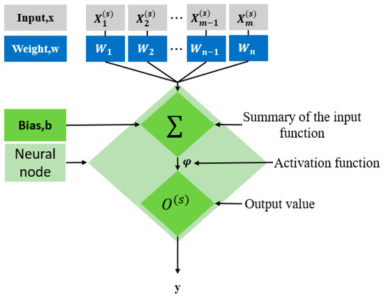 After obtaining the quality indicators that affect the key parameters of product molding quality, they need to be used as the input parameters of the neural network model for learning and training to complete the monitoring of the injection molding process and the prediction of molding quality. As a neural network model continues to input data for training and prediction in the production process, its training model will gradually improve, the more accurate the prediction results will be and the closer they will be to the actual results, i.e., it will be able to achieve adaptive process control. In this paper, the ANN learning model consisted of three main components: an input layer, a hidden layer and an output layer, which were used as a neural network model. The input layer received the input vectors and then passed each input data point to the neurons in the hidden layer. The neurons (also called neural nodes) in the hidden layer contained the summation function and the activation function. Figure 2 shows a single-neuron perceptron model, where the activation function (Equation (6)) is a nonlinear function used to map the summation function to the output value y where x, w, b and y denote the input vector, weight vector, deviation and output value, respectively, and denotes a constant.