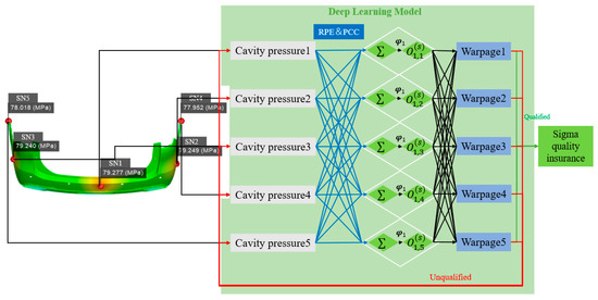 In contrast to the study proposed by M. S. Huang et al. [22] in 2021, which was based on a neural network model for predicting the conformity of the molding quality of injection-molded products, this study focused on determining whether the molding quality of an IC tray fell in the qualified or unqualified region in a neural network model. The defects of an IC tray are relatively simple; they are only affected by a single weight when the neural network assigns weights. However, for most injection-molded products, the molding quality is affected by the interaction of many different defect factors, so it is necessary to assign weights to these multiple defect factors in the neural network, and, if we continue to use the neural network to assign multiple weights, we cannot identify the different degrees of influence of these different defect factors on the molding quality of the same product, while RPE can identify the impact of different defect factors on the molding quality of injection-molded products and define an exact comparable value for reliable, quantitative comparison analysis. Therefore, this study applied RPE and PCC to the neural network as a way to build a deep learning network model, which helped to assign the influence of multiple weights on the product molding quality and, thus, improved the accuracy of the deep learning network in prediction in this study. As shown in Figure 6, the deep learning network in this study applied RPE and PCC to the neural network multivariate weight assignment to effectively identify and analyze the degree of influence of the cavity pressure on its warpage value at five different locations within the mold cavity and derive the warpage prediction value of the bumper.