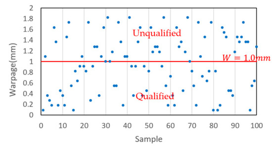 The plastic bumper application material in this study was PP, and Figure 8a shows the basic geometry of the plastic bumper in this study, which was a large and thin, flesh-thick manufacturing part, so the product as a whole was not allowed to produce a large warpage deformation. In the production process, we found that the most serious location of warpage displacement of plastic bumpers in this study was the deformation displacement of the distance between these two points of the bumper in the horizontal direction shown in Figure 8b; so, this study considered the warpage deformation () of this length in the horizontal direction as the key quality affecting the overall warpage deformation of the product. As shown in Figure 9, a threshold value (1.0 mm) was set for the warpage () of the bumper, i.e., when the warpage of the bumper was , the bumper met the product quality requirements (qualified); when the warpage of the bumper was , the bumper did not meet the product quality requirements (unqualified). The warpage values were taken to two decimal places to obtain a neural network model with higher learning accuracy and stability. The warpage in this study was defined as the value of the deformation displacement of any point on the bumper in spatial coordinates with respect to the design coordinates.