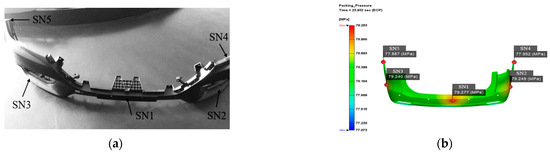 In this study, pressure sensors were installed at the corresponding locations in the mold cavity to detect the pressure signal in the cavity and to study the flow state of the melt and its response to the quality index. The locations of the pressure sensors are shown in Figure 10a, where SN1, SN2 and SN3 are located at the gate, and SN4 and SN5 are located at the end of the filling.