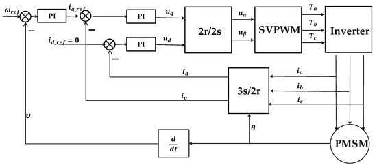According to Equation (5), the speed loop of the surface mount PMSM vector control system has a linear relationship between the output speed and the q-axis current, the motor speed can be controlled by control . Figure 1 shows a schematic diagram of the FOC vector control system.
