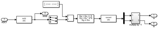 For the acquisition of phase current, it is only necessary to collect AB two-phase current. Since the ADC of C2000 series is unipolar, it cannot collect negative voltage signals. Bipolar signals need to be biased, and the bias voltage is set to 1.65 V. The current signal can be converted into a 0~3.3 V voltage signal that can be processed by the embedded hardware, and then the collected data is shifted to the left by 6 bits to form a normalized Q17 format, and the output data is set to fixdt (1,32,17). The current acquisition and data conversion model is shown in Figure 4: