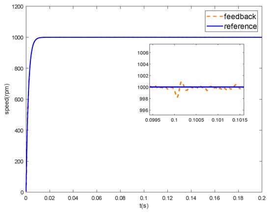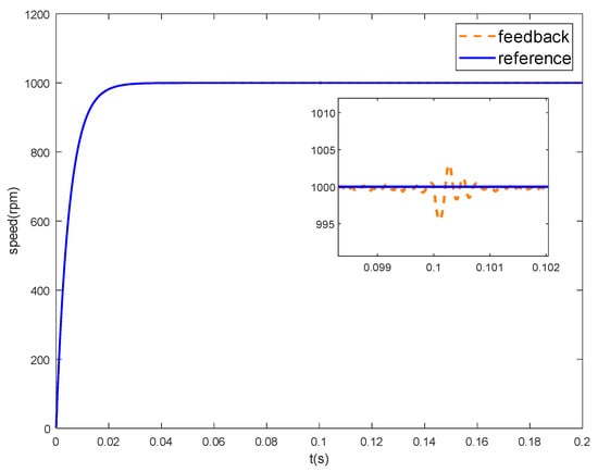 The golden-section speed adaptive control scheme is sensitive to step signals, so first-order low-pass filtering is used to process the input reference signals. The filtering coefficient has different influences on the system results. The reference speed is set at 1000 RPM and the simulation time is 0.1 s and Figure 10, Figure 11, Figure 12 and Figure 13 show the speed response curves under different values.