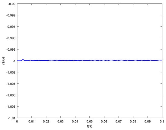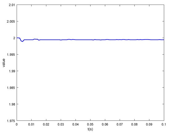 When the sampling time is small enough, the range of characteristic parameters , generally, takes the initial value of parameter identification . Set the simulation time to 0.1 s, the reference speed to 1000 rpm, and the filter coefficient . Figure 15, Figure 16 and Figure 17 show the online parameter identification results of the second-order characteristic model. It can be seen from the figure that the identification parameters have little change after steady-state operation, which further indicates that the speed adaptive system has strong stability.