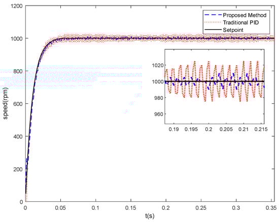As can be seen from Table 2, our method has better performance than the results of nonlinear golden-section control and traditional PID control. The proposed method does not contain high-order terms, so it has fast regulation speed, which makes it superior to NGSC and PID in rapidity. In terms of average volatility, for the same experimental platform, after the motor enters steady-state operation, the average speed error of the proposed method is 2.3 rpm, the average speed error of NGSC is 4.3 rpm, while the traditional PID is as high as 11 rpm, which shows that the characteristic model and golden-section control have advantages in control accuracy. In conclusion, the proposed method has advantages in rapidity and accuracy.