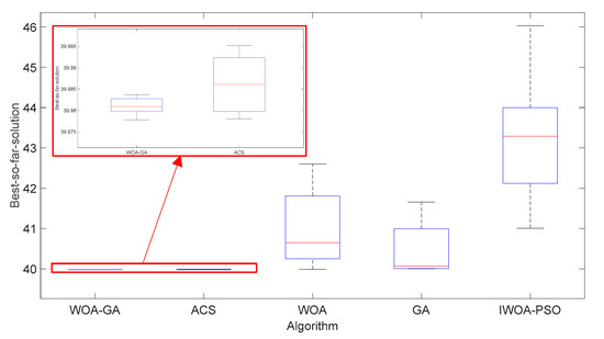 Figure 3 shows the distributions of the best-so-far solutions from WOA-GA, WOA, GA, IWOA-PSO and ACS. Additionally, the percentage of performance rank in