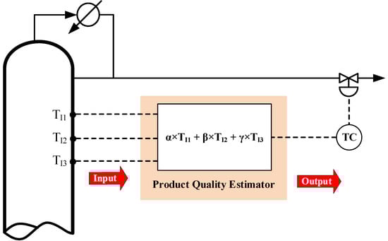 Figure 1 gives the schematic of the PQE proposed for the control of the DWDC. Its inputs are temperatures of three stages located in the controlled column section (TI1, TI2, and TI3), and its output is equal to a linear sum of these three inputted stage temperatures (α × TI1 + β × TI2 + γ × TI3). The temperature difference [16,17] and the double temperature difference [18,19] have demonstrated that detecting multiple stage temperatures is an effective method to overcome the adverse effect of pressure variations. This is the main reason why three stage temperatures are measured and inputted in the PQE. Further, someone might ask why the number of the inputted stage temperatures is determined to be three, not two, or a number greater than three. There are mainly the following two reasons: one is that at least three stage temperatures are required if someone wants to clearly and rapidly detect the temperature variations of one column section; the other is that using more temperatures cannot obtain an obvious improvement in detection quality but increases the complexity and equipment cost of the PQE.