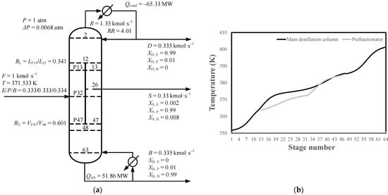 Example of the EPB Petlyuk DWDC: (a) steady-state design; (b) temperature profile.