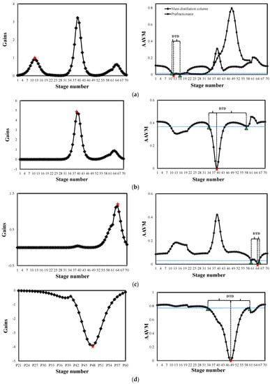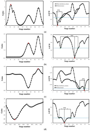Results of the sensitivity analysis and AAVM analysis (Example I): (a) top control loop; (b) sidestream control loop; (c) bottom control loop; (d) prefractionator control loop. (Red pentagram: sensitive stage; green triangle: reference stage).