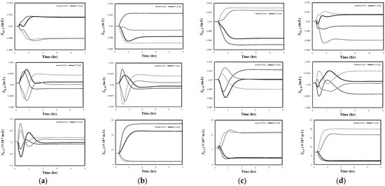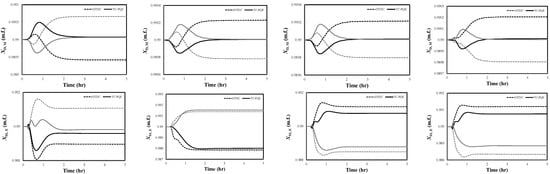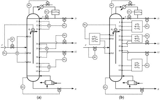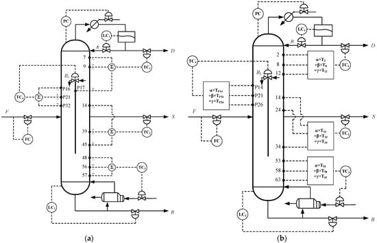 For the DTDC scheme, four double temperature difference control loops with distillation flow rate D, sidestream flow rate S, reboiler heat duty Qreb, and liquid split ratio RL as manipulated variables are employed to maintain the purities of the top, sidestream, bottom, and prefractionator’s top products (liquid composition of component B in the top of the prefractionator), respectively. Figure 4 gives the results of sensitivity analysis and AAVM analysis for the four double temperature difference control loops. With reference to these results, the locations of the sensitive and reference stages of each double temperature difference control loop can be determined, and the resultant DTDC scheme is shown in Figure 5a. As for the detailed method of how to derive the DTDC scheme in terms of the results of sensitivity analysis and AAVM analysis, it can be found in our previous article about the effective derivation of the DTDC scheme [19].