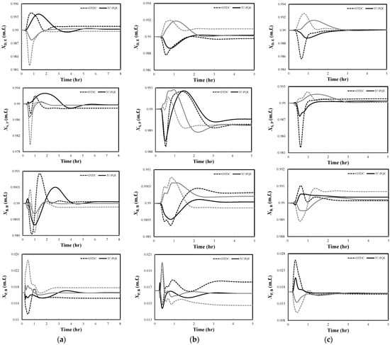 For the DTDC and TC-PQE schemes, all temperature measurements are assumed to have a one-minute deadtime, and PI controllers are used in all temperature inferential control loops. The Tyreus-Luyben tuning rule embedded in Aspen Dynamics is used to tune these PI controllers [21,22]. The bottom control loop is tuned first because it affects all other control loops. Then, with the bottom control loop on automatic, the top control loop is tuned. Next, with the bottom and top control loop on automatic, the sidestream control loop is tuned. Finally, with the bottom, top, and sidestream control loops on automatic, the prefractionator control loop is tuned. Three rounds of tuning are carried out at least to ensure the quality of the parameters obtained. The resultant controller parameters for the DTDC and TC-PQE schemes are listed in Table 3. Figure 7 shows the variations of the product purities as the EPB Petlyuk DWDC controlled under the DTDC and TC-PQE schemes for ±20% variations in feed compositions. It can be seen that, as compared with the DTDC scheme, the TC-PQE scheme has smaller overshoots in the controlled product purities for all six kinds of feed composition disturbances and shorter setting times for the feed composition disturbances in components P and B. Table 4 tabulates the steady-state deviations in the controlled product purities from the initial 99 mol% product specifications. In most scenarios, the TC-PQE scheme shows smaller steady-state deviations than the DTDC scheme. As for the maximum deviation of the controlled product purities (highlighted using bold type and underlining in Table 4), the TC-PQE scheme is also smaller than the DTDC scheme.