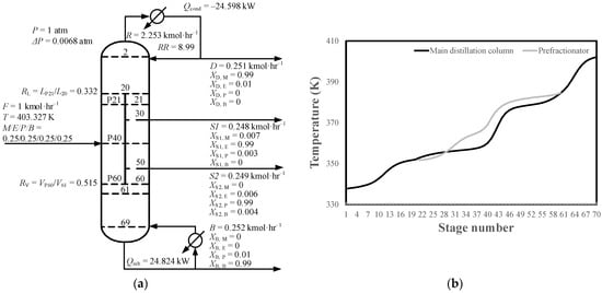 Figure 8a,b give, respectively, the steady-state design of the MEPB Kaibel DWDC and its temperature profile. The mole ratio between feed components M, E, P, and B is 1:1:1:1. The specifications for the top, upper sidestream, lower sidestream, and bottom products are all 99 mol%.