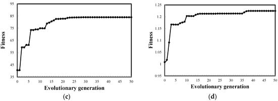 For the sake of fairness, the number of control loops used in the TC-PQE scheme should be the same as that in the DTDC scheme. Therefore, four control loops with D, S, Qreb, and RL as manipulated variables are employed in the TC-PQE scheme, and four specially designed PQE are used in these four control loops to infer the qualities of the top, sidestream, bottom, and prefractionator’s top products, respectively. The design variables of the four PQE are optimized according to the genetic algorithm introduced in Section 2. Here, population size is equal to 2000; evolution generation is equal to 50; crossover and mutation probabilities are respectively equal to between 0.7 and 0.3. For the optimization of the PQE employed in the top, sidestream, bottom, and prefractionator control loops, the locations of the inputted stage temperatures are respectively allowed to be selected from the public rectifying section, the right section of the dividing wall, the public stripping section, and the prefractionator, and the lower limits of the static gains are respectively equal to 1.7027, 1.283, 0.521, and 0.4235 (here, for each control loop, the lower limit is set to be two times the static gain between the sensitive stage temperature and the manipulated variable). Figure 6 displays the optimization processes of the PQE employed in the four control loops using a genetic algorithm. According to the optimization results, four optimal PQE can be obtained, and their detailed parameters are listed in Table 1. Figure 5b displays the resultant TC-PQE scheme.