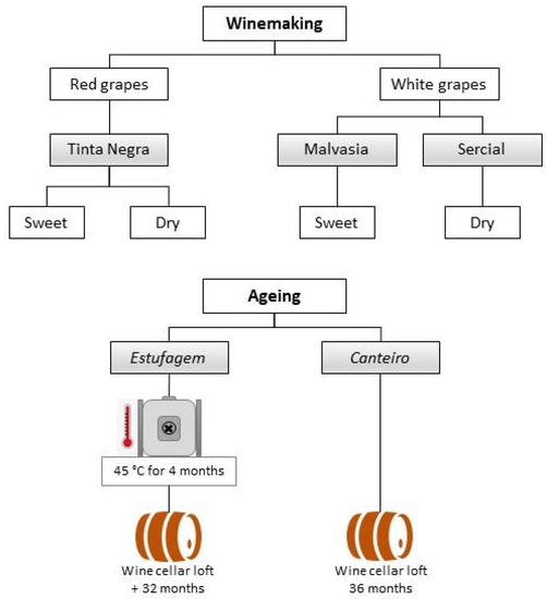 Madeira wine (MW) is a fortified alcoholic beverage from Portugal, known worldwide for its unique characteristics. It holds an alcoholic content between 17% and 22% (alcohol by volume, ABV), and it can be made from red and white Vitis vinifera L. grapes. The most recognised varieties are white ones, such as Sercial, Verdelho, Boal, and Malvasia, which are usually used to produce dry, medium-dry, medium-sweet, and sweet wines, respectively. However, the bulk production is made from Tinta Negra, a versatile red variety used to produce all wine styles [1]. The ageing process makes these wines distinctive, particularly because it can include intentional thermal processing.
