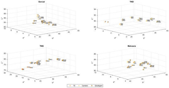 CIELAB coordinates of the Malvasia, Sercial, and Tinta Negra Sweet (TNS) and Tinta Negra Dry (TND) wines during canteiro vs. estufagem ageing for up to three years. The numbers labelled at each point correspond to the ageing days.