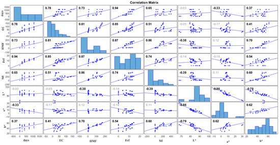 Plot matrix of correlations in estufagem among the pairs of variables studied: sotolon (Stl), furfural (Frf), HMF, EC, colour parameters (L*, a*, nd b*), and ageing time (days). The Spearman correlation coefficient can range from −1 to +1.