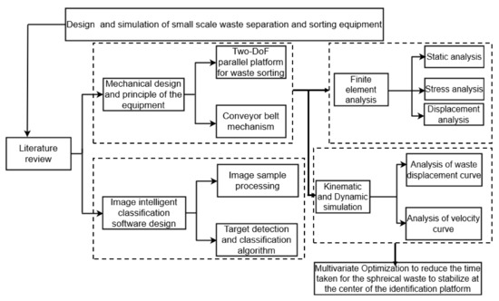 In this paper, an automatic separation and sorting equipment for small-scale waste management was designed to circumvent the limitations of conventional systems. The mechanisms effectively alleviate the complexity of mixed disposal in the small-scale waste classification system and have high potential for field application. In addition, the sorting speed was improved from the perspective of mechanical design, resulting in a faster speed compared with that of similar structures. The mechanisms were fully linked with image acquisition and computer vision processing and are highly effective in waste classification. Therefore, the present study presents a mechanical equipment with higher reliability and better efficiency for small-scale waste separation and sorting systems. This system provides a basis for development of intelligent waste classification techniques. The experimental design of the present study is presented in Figure 1.