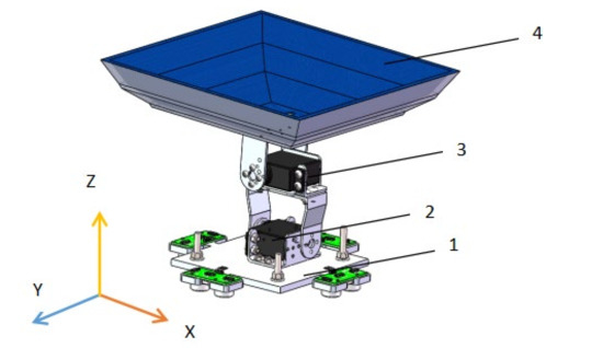Two-degree-of-freedom parallel platform. 1. Base, 2. Lower steering gear, 3. Upper steering gear, 4. Waste identification platform.