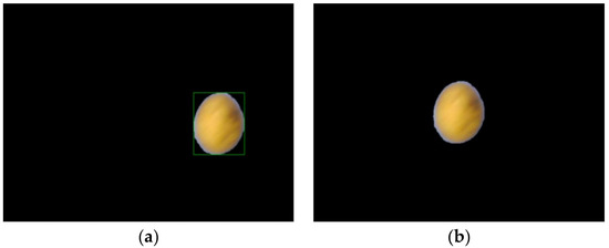 Processing effects before and after color space separation and filtering. The sample is an image of a rolling potato taken with a 2-megapixel camera: (a) Pre-processing effect of color space separation and filtering. (b) Post-processing effect of color space separation and filtering; in the black background, the material entity is the main part, with some noise occurring in the background. The noise appears in the form of tiny white patches in the picture.