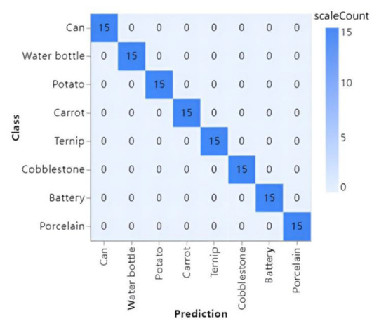 The confusion matrix image is presented in Figure 8. The accuracy rate of all kinds of garbage recognition in the test set comprising 15 images in each of eight categories reached 100%, the theoretical test results of the YOLOv5 algorithm were good, and the accuracy was high.