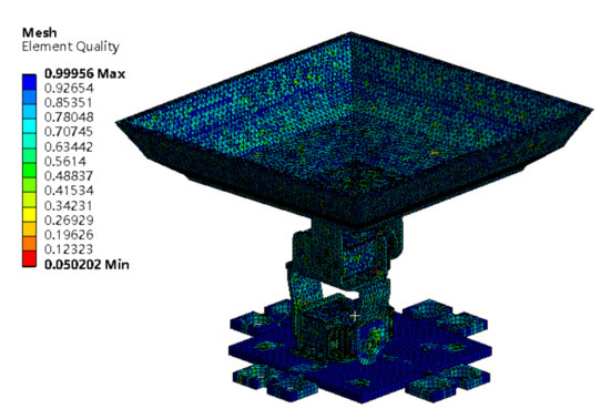 ANSYS software was used for meshing [30], and the element size control mode was set as fine. Hexahedral elements were utilized for the structurally simple entities such as the base and steering arm. Tetrahedral ten-node elements were used for the identification platform. The target quality of mesh was set to 0.5, and high-quality mesh smoothing was applied. The model was preliminarily divided into 127,497 units and 233,093 nodes. The mesh quality is presented in Figure 9. Analysis of the mesh showed that the overall quality was between 0.85 and 1, which satisfied the requirements (Figure 9).