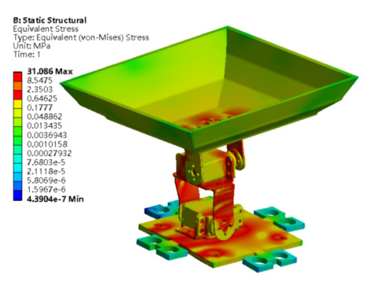The gravity loads were set at appropriate positions in the sorting mechanism. The overall stress map of the platform after mechanical analysis is shown in Figure 10. The maximum stress was observed at the support arm of the steering gear and the contact position of each connection, since the load of the upper structure produced torque. The maximum stress was 31.086 MPa, which was significantly lower compared with the maximum allowable stress and the yield strength of the material. This implies that the design met the strength requirements.