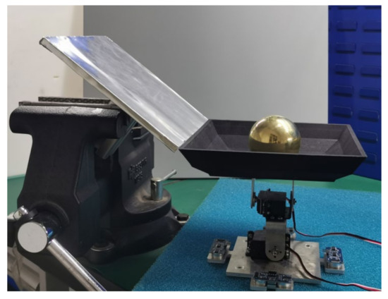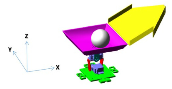 The two-DoF parallel sorting mechanism comprises a base, a driving steering gear, a rocker bracket, and a waste identification platform (Figure 3). The upper and lower steering gears were adopted to provide the rotational torque of the platform. The rocker bracket transmits torque and withholds loads. The lower steering gear ensures that the identification platform rotates at +80° or −80° around the x-axis, achieving delivery of hazardous waste and recyclable waste, respectively. The upper steering gear rotates the identification platform at +80° or −80° around the y-axis to achieve delivery of other types of waste and kitchen waste. The design proposed in the present study only requires one steering gear to perform an 80° rotation and a reset function for each type of waste. Testing of a physical prototype revealed that the one-step sorting was completed in about 1 s with the motor at full speed, and the efficiency was four-fold higher compared with that of traditional two-step methods.