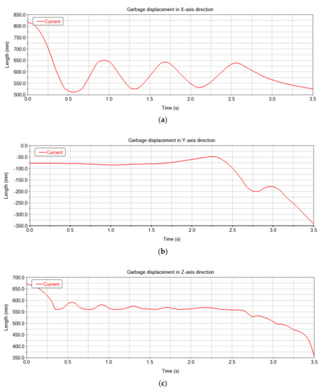 - A dynamic simulation was performed to simulate the movement of spherical waste in the sorting mechanism. The simulation results revealed that all waste–including the waste with the most unstable spherical shapes–did not fall out of the identification platform. This implies that the waste identification platform was effective in receiving and handling different types of waste. The simulation displacement curves demonstrated that the waste was stabilized at the center of the identification platform within a short time, resulting in rapid and accurate waste image collection.