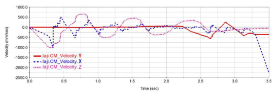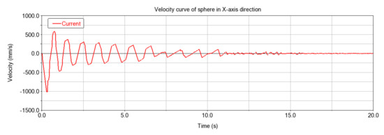 The velocity curve of the sphere in the x-axis direction obtained through kinematic and dynamic simulation is presented in Figure 20. The curve exhibited a sinusoidal waveform with decreasing amplitude centered around Vx = 0.