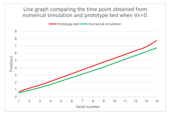 Line graph comparing the time point obtained from numerical simulation and prototype test when Vx = 0. The x-axis represents serial number of the time point, and the y-axis denotes the time when the velocity of sphere becomes zero in the x-axis direction. The maximum absolute error of the 14 points is 1.02 s, with a relative error of 13%. The absolute error of other time points is below 0.67 s, which satisfies the requirements of the prototype.