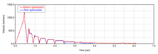 Comparison of the velocity of the spherical waste before and after optimization. The time taken by the spherical material to roll down from the top of the slideway to the stable and stationary position at the center of the identification table was shorter after optimization, and the speed convergence effect significantly improved.