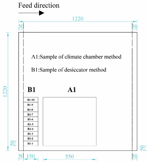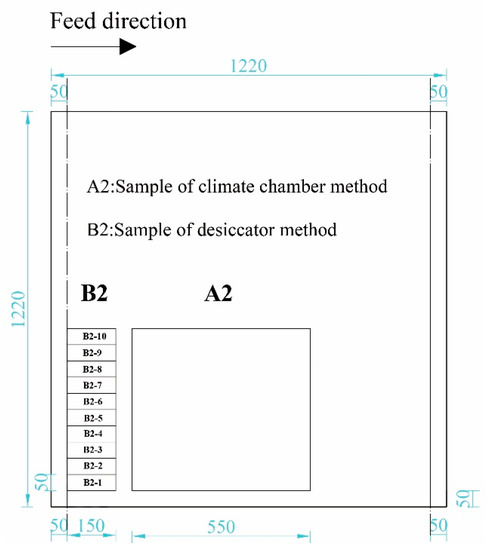 The samples whose formaldehyde emissions were measured using the 1 m3 climate chamber method of GB/T17657-2013 comprised group A. Two pieces with dimensions of 500 mm × 500 mm × 18 mm were made, respectively from sample 1 and sample 2 according to the positions shown in Figure 2 and Figure 3. The samples whose formaldehyde emissions were measured using the desiccator method of GB/T17657-2013 comprised group B. Ten pieces with dimensions of 150 mm × 50 mm × 18 mm were prepared from sample 1 and sample 2 according to the positions shown in Figure 2 and Figure 3. An additional standby group was prepared, totaling 30 pieces. For example, the samples for the 1 m³ climate chamber method were labeled 1-A1 and 1-A2, and the samples for the desiccator method were labeled 1-B1, 1-B2, and 1-B3. The other groups were named in the same way. The cutting edge and ends of each sample needed to be at least 50 mm from the plate edge.