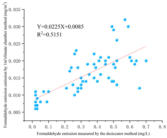 From the results provided in Table 1, the correlations between the two methods were analyzed using IBM SPSS Statistics 25 statistical software. The formaldehyde emission data obtained from the desiccator method were plotted on the abscissa, and the formaldehyde emission data obtained from the climate chamber method were plotted on the ordinate. The relationship between the two different measuring methods is depicted in Figure 4.