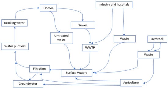 One of the main inputs of emerging contaminants into wastewater and the aquatic environment is through direct discharge of substances used in households, industry, hospitals, livestock, and agriculture into sewers (Figure 2). Another route is human excretion; emerging pollutants are consumed by humans and then excreted in parent compound form or as metabolites, which sometimes are not degraded or altered in wastewater treatment plants (WWTPs) [].