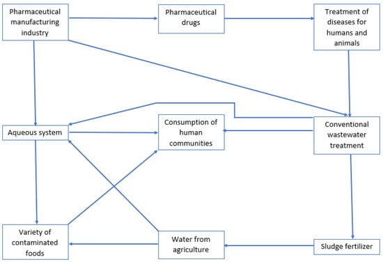 Also, since pharmaceuticals are designed to increase their biological activity at low concentrations because they are used for diseases treatment in both animals and humans, their unintended presence risk in the environment and drinking water increases; thus, they should be removed from wastewater (Figure 3) and drinking water []. In addition, there is concern about the unintentional consumption of pharmaceuticals in drinking water, which can cause long-term adverse effects on human health [].