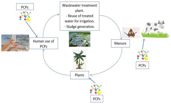 Distribution of personal care products (PCPs) via wastewater in the environment and the food chain, adapted and modified from [].