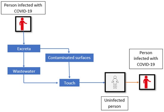 Figure 5 shows, in general, how the COVID-19 disease can be contracted through wastewater. It should be mentioned that SARS-CoV-2 can survive from hours to seven days, depending on the type of matrix in which it is found [].