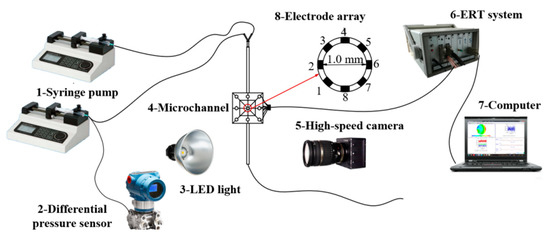 The transparent circular microchannels used in this study were self-made in the laboratory. The microchannel adopts a Y-type mixing mode with an included angle of 60° and each interface is connected by a catheter. The material is polytetrafluoroethylene. The microchannel is bonded together by two upper and lower plexiglass tubes with a hydraulic diameter of 1 mm and a length of 15 cm. L/D ≈ 150, which is enough to eliminate the effect of the outlet section on the fluid flow. The upper and lower two pieces of plexiglass (1 × 1 × 1 cm) are the cover sheets, and the middle piece of plexiglass (4 × 4 × 0.3 cm) is the mainboard. In the experiment, the air was used as the dispersed phase, water, glycerin aqueous solution and ethanol aqueous solution were used as continuous phases. The experiments were carried out at room temperature (25 °C) and atmospheric pressure. We use Capacitive differential pressure sensor and ERT to monitor the pressure drop in microchannels. The experimental process is shown in Figure 1.