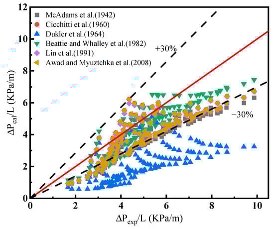At present, there are many correlations for the viscosity of two-phase mixtures, but the key to the application of the HFM model in microchannels is to select the correlations correctly. Therefore, this paper selects the typical correlations of six viscosities in the literature [12,13,14,15,16,17]. The results are shown in Figure 2. In this study, the bubbly flow accounts for a relatively large proportion of the data.
