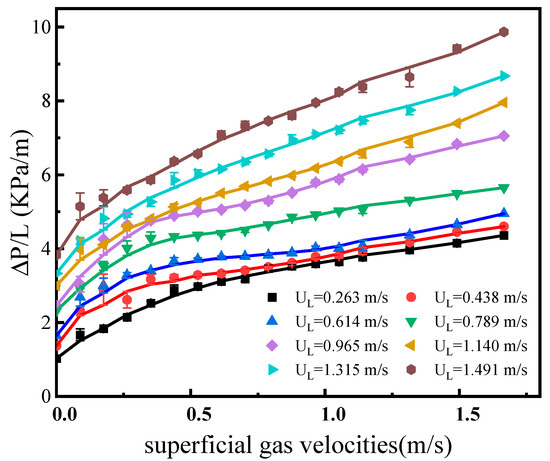 When only liquid flows in the microchannel, it can be seen that as the apparent liquid velocity increases, so does the frictional pressure gradient of the liquid phase. When two phases of gas and liquid pass through the microchannel at the same time, the frictional pressure gradient raises as the apparent flow rate of the liquid increases. On the contrary, when the apparent liquid velocity is constant, the frictional pressure gradient increases as the apparent gas velocity increases. Furthermore, as the bubble flow transits to the slug flow, the frictional pressure gradient decreases. It indicates that there is a correlation between the frictional pressure gradient and the flow pattern, as shown in Figure 5.
