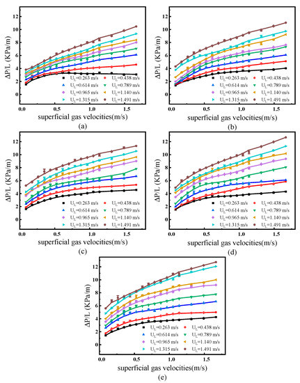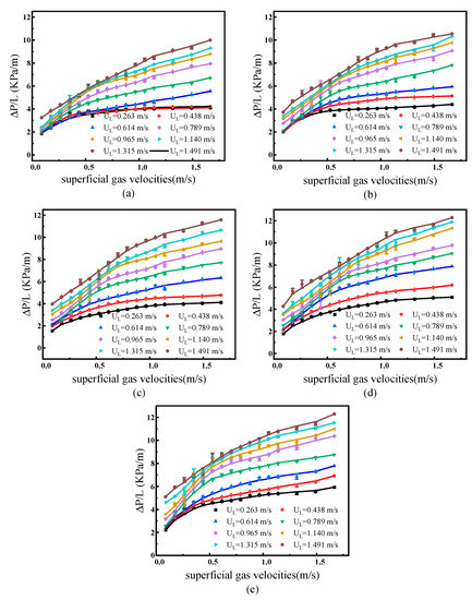 Frictional pressure gradient of glycerol aqueous solution (5–25 wt%)-air two-phase flow in microchannel: (a) 5 wt% glycerol aqueous solution, (b) 10 wt% glycerol aqueous solution, (c) 15 wt% glycerol aqueous solution, (d) 20 wt% glycerol aqueous solution, (e) 25 wt% glycerol aqueous solution.