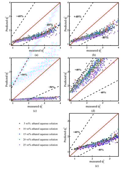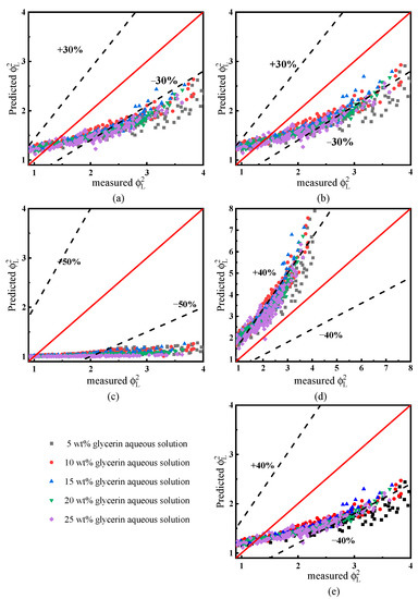 Comparison of correlation predicted value and experimental value under different liquid viscosity: (a) Lockhart and Martinelli correlation, (b) Mishima and Hibiki correlation, (c) Lee and Lee. correlation, (d)Zhang et al. correlation, (e) Li and Wu. correlation.