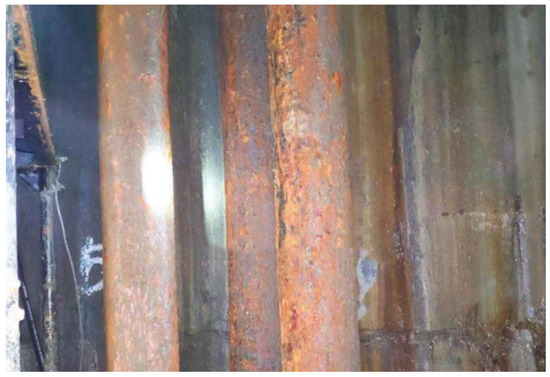 The overall construction process comprised a total of 61 grouting holes and was grouted with 23.8 tons of cement. The slurry plugging construction before the shaft gushing water was approximately 5.2 m3/h, whereas the grouting plugging construction after the shaft gushing water was about 0.98 m3/h. The shaft gushing water decreased by 81%, showing that the grouting plugging effect was significant. Optimization of the parameters after construction increased the service life of the shaft facilities, reduced operation and maintenance costs, and provided a strong guarantee for safety and standardization of the mine. A representation of the shaft before and after slurry injection at 146 m is presented in Figure 13.