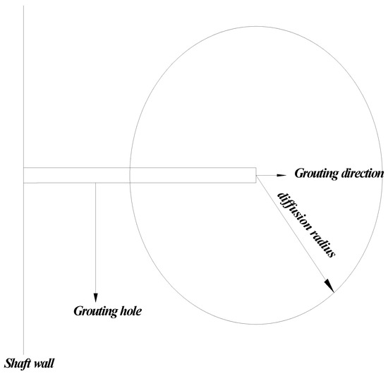 where Kw represents the permeability coefficient of water to the surrounding rock and soil. P indicates the initial grouting pressure of the slurry for single-hole injection, expressed in MPa. Pr represents the final pressure of the slurry after diffusion in the soil (this generally refers to the hydrostatic pressure of the surrounding rock behind the wall near the orifice), expressed in MPa. α indicates the coefficient related to the inherent properties of the slurry. t represents the grouting time in min. r0 indicates the radius of the grouting hole in m. μg represents the viscosity of the slurry. r represents the grouting radius in m. The slurry exhibits spherical diffusion in single-hole grouting. The total grouting volume is expressed as Q = 4φπr3/3, which can be obtained by substituting this expression into Equation (1) and then simplifying the equation to obtain the diffusion radius of the slurry as follows:
